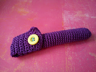 Het nadeel van zpagetti is de ruimte tussen de steken. Genoeg ruimte om een haaknaald voorgoed te laten verdwijnen. Na een aantal pogingen tot een praktische etui is dit het resultaat!